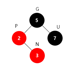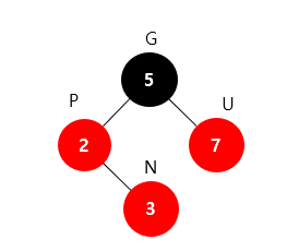 1. 새로운 노드(N)의 부모(P)와 삼촌(U)을 검은색으로 바꾸고 조상(G)을 빨간색으로 바꾼다.